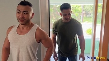 On a drab, unassuming street, Asian-American buddies Krozzy and Hunter spot their house they rented on GayBnB, and it seems to be a little sketchy. Weird thumps and things that go bump in the night tip them off that their stay might not be the deluxe tropical vacay they hoped for. They split up in search of their rooms (like that's ever a good idea in a horror tale). When Krozzy finally finds an unlocked door that leads down to the basement he heads down, leaving Hunter wondering where he's gone. In the basement sex dungeon, decorated with a display of dildos and creepy cosplay masks, dungeon keeper sexy femme boy Shae welcomes Krozzy. Watching Krozzy's reaction to the wall of dicks, she asks "Does it give you any ideas?"
