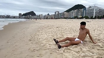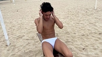 Sprawled across a sofa, Hanry rubs a palm across the bulge in his white bikini. His big uncut meat pops out of the waistband, and his heavy nuts soon droop out of the bottom of his swimsuit. Stroking, his meat swells up even larger and his head rolls back dreamily. He turns over and seductively runs a wet finger over the pucker of his tan ass. He jerks his cock between his legs, looking back to admire the skin rolling back over the thick head. As he gets close, Hanry bites his lip and groans. His tight abs tense up and he closes his big brown eyes. A creamy white splatter shoots out as he pants to catch a breath. Looking into the camera, he flashes a pearly smile and bids us goodbye.
