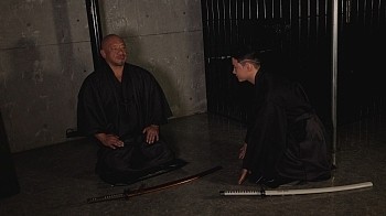 Along an ancient windy bay lit by the reflected lights of a Japanese village, a wounded but defiant European warrior washes ashore. Anjin, the Barbarian (Mika Ayden) is unbowed as he's found by a patrolling samurai. "I PISS on your country!" he exclaims as the sword-wielding samurai warns him to stop and surrender. Anjin gets a faceful of piss in return for his insolence. Dragged by the hair to the Japanese encampment, Anjin's surprised when the samurai Manabu kneels down to lock him in a rough manly kiss.