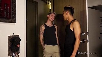 Jeremy Vuitton must be getting tired of all these studs looking for Chris, but since he gets his butt plowed with every mistaken visit, maybe NOT? Jeremy's hit the jackpot when adorable, built blond cutie Zak Bishop wants to "hang out" with Chris. Jeremy offers "Is there anything I can do?" and two horny bareback studs are off to the races. After a kiss and a little grab ass, Jeremy drops to his knees to get a mouthful of Zak's long thick tool. "Chris sucked a dick better than that, c'mon boy!" Zak challenges, and Jeremy gets to work proving his oral talents.