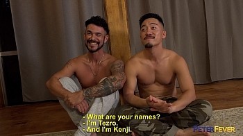We've seen handsome Tezro before, and verrrrry recently. He was in this exact same situation, answering our questions about his true love relationship, but then he was paired with golden-haired twink Haru. Now why is he sitting arms entwined with sexy half-Latino stud Kenji?